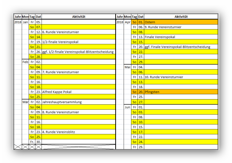 Der o.a interne Plan erfährt noch Ergänzungen durch die externen Termine der Mannschaftskämpfe(sonntags) sowie des 4er-Pokals(samstags). Die Termine für den Alfred-Kappe-Pokal und die Jahreshauptversammlung - Ende Februar resp. Anfang März 2018 - sind aus der Tradition heraus so eingeplant worden, wobei insbesondere die Terminierung der Jahreshauptversammlung dahingehend kritisch zu hinterfragen ist, ob eine Verlegung auf einen Termin nach Abschluß aller internen und externen Veranstaltungen nicht sinnvoller wäre, um eine vollständige und abschließende Beurteilung der vergangenen Spielzeit vornehmen zu können.