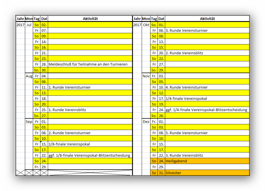 Ausgehend von diesen Annahmen bedeutet dies, dass maximal 24 unserer Spielabende terminlich fest mit Veranstaltungen fixiert werden müssen, wobei die 4 Termine für die Blitzentscheidung im Rahmen des Vereinspokals keinen obligatorischen Charakter haben, sondern nur bei Bedarf belegt sind. Davon ausgehend, daß in einem Monat nur max. 1 Termin pro Turnier festgelegt wird, fallen einerseits in 2 Monaten des Spieljahres - in der Terminvorlage(s.u.) sind dies Juli 2017 und Juni 2018 - keine Termine an und andererseits sind in den restlichen 10 Monaten nur rd. 50 Prozent der verfügbaren 43 Spielabende fest belegt, so daß noch ausreichend Freiraum für andere Aktivitäten - z.B. Partieanalyse, Training o.ä. - bleibt.
